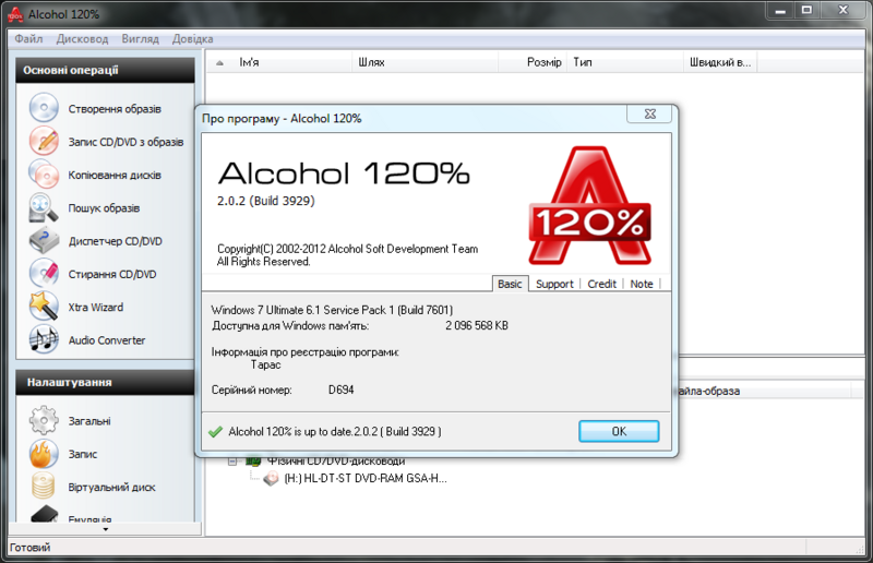 Активація: 1. Встановити програму 2. Копіювати файл MSIMG32.dll в папку з встановленою програмою 3. Alcohol 120% активовано