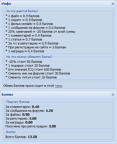 Представляю вашему вниманию уникальный скрипт баллов. Он чем-то напоминает скрипт денег за ваши материалы, но только вместо денег тут баллы. Установив такой скрипт, вы сможете оценивать активных пользователей, а также устраивать им конкурсы.